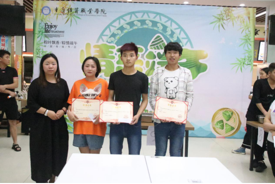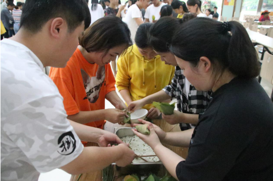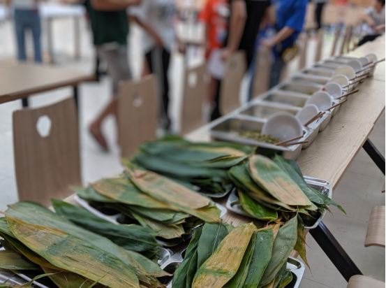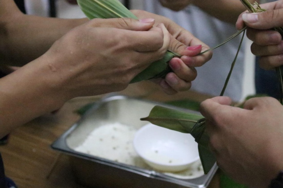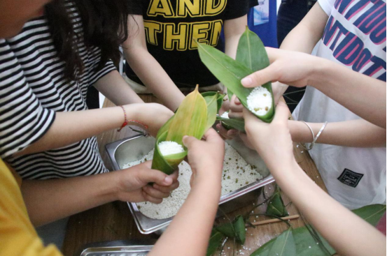 第二个环节“粽情包粽”在五分钟试包结束后,同学们眼疾手快的忙碌着裹叶、放米、舀馅、绕绳、打结可谓一气呵成!青绿的粽叶,雪白的糯米,穿梭的手指,整个餐厅洋溢着节日的气氛和同学们欢快的笑声。