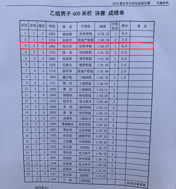 本次比赛由体育教研室黎欢老师带队参赛,beat365官网运动健儿参加本次大学生田径锦标赛乙组的比赛。其中秦迎春同学喜获男子400米栏第一名,郑文杰同学获男子110米栏、400米栏两项第三名。