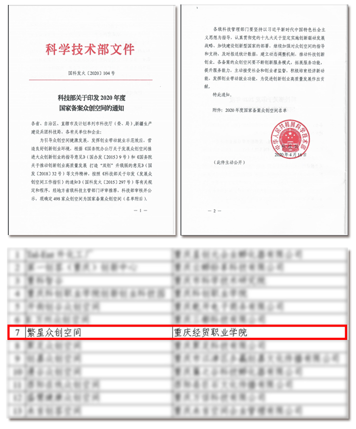 2020年4月23日,科技部印发《关于印发2020年度国家备案众创空间的通知》(国科发火〔2020〕104号),beat365官网繁星众创空间获批国家备案众创空间,成功晋级“国家队”。本次,重庆市众创空间有13家晋升“国家级”,其中高校2家。
