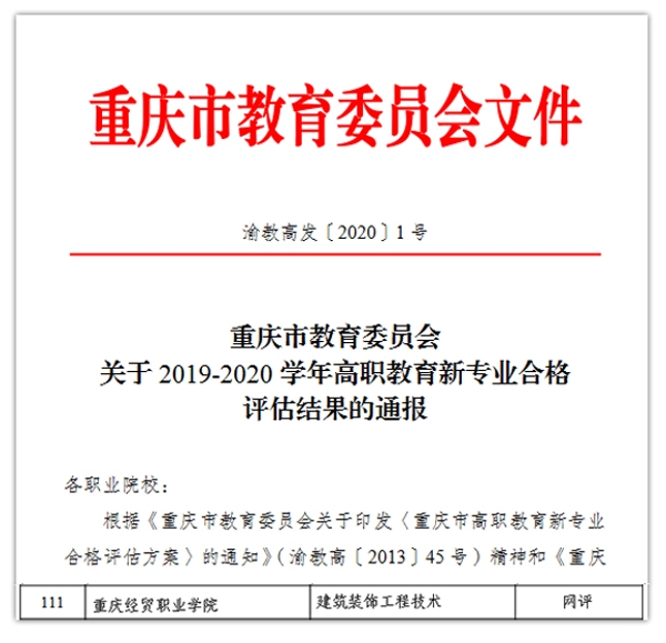 近日,重庆市教委下发《重庆市教育委员会关于2019-2020学年高职教育新专业合格评估结果的通报》(渝教高发〔2020〕1号),在2019年对全市36所高职(专科)院校129个高职新专业评估工作中,beat365官网应用工程学院建筑装饰工程技术专业顺利通过合格评估。