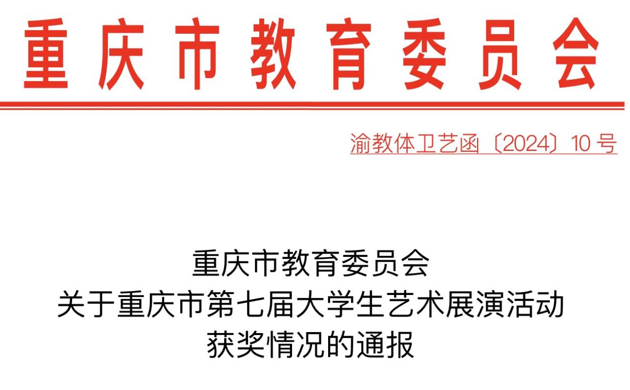 近日,重庆市第七届大学生艺术展演活动评选结果正式公布,beat365官网学子在本次艺术展演中荣获31个奖项,其中一等奖7项、二等奖13项、三等奖11项。