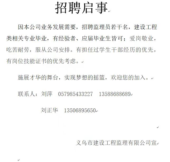 义乌市建设工程监理有限公司招聘启事