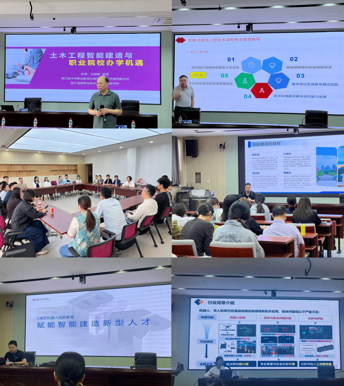 在专题报告环节,浙江省中华职业教育社教育科研工作委员会副主任朱国锋从产教融合角度提出人才培养方案,建议通过校企合作构建“理论+实操”一体化培训体系,缓解行业人才缺口问题。山东大学信息学院高级工程师陆小珊作了题为“聚焦智能,探索智能建造技术专业建设路线图”的专题报告,提出了基于岗位增量模式的专业人才培养新思路。浙江大学研究员舒江鹏则深入讲解了智能建造与数字孪生技术的融合应用,为智慧城市的建设提供了重要的技术视角。浙江建设职业技术学院智能建造技术专业负责人王琳结合实地教学经验,展示了智能建造技术在危旧房改造等工程中的创新应用。此外,机器人企业代表现场演示了建筑机器人自动化施工流程,凸显了智能化装备在降低人力成本、优化工程精度方面的优势。研修班还组织学员赴浙江大学国际医学院项目部实地观摩,通过案例研讨提升技术落地能力。