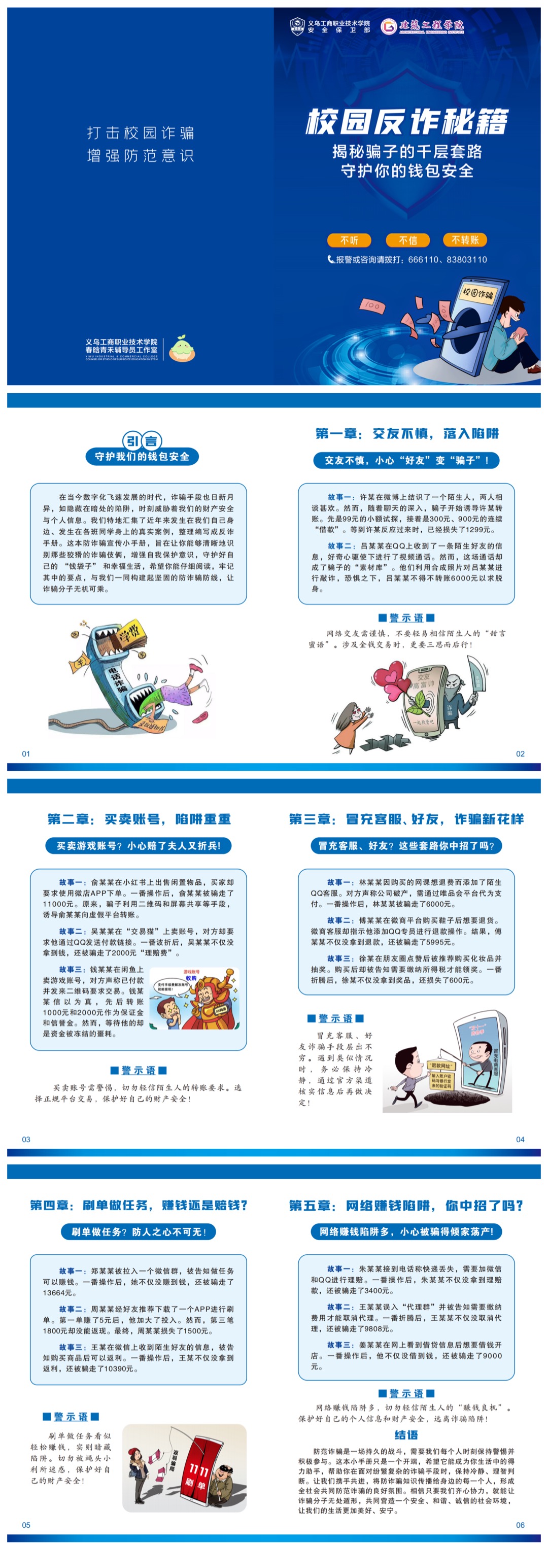与此同时,一本涵盖多元诈骗场景的反诈小册子如及时雨般在校园内广泛流传。小册子精心编著,以图文并茂、案例详实的形式,全方位狙击各类网络诈骗“暗箭”。这本校园反诈秘籍,旨在打击校园诈骗并增强防范意识。封面有“不听、不信、不转账”的提示及校园报警咨询电话。内容分为五章,分别是:交友不慎、买卖账号、冒充客服或好友、刷单做任务、网络赚钱陷阱等。每章都包含多个具体案例,并配有警示语,详细阐述了各种诈骗手段及其危害,提醒学生提高警惕,保护个人财产安全。这本小册子人手一本,伴随师生穿梭于教室、图书馆、食堂之间,成为校园里独特的“防骗风景线”。